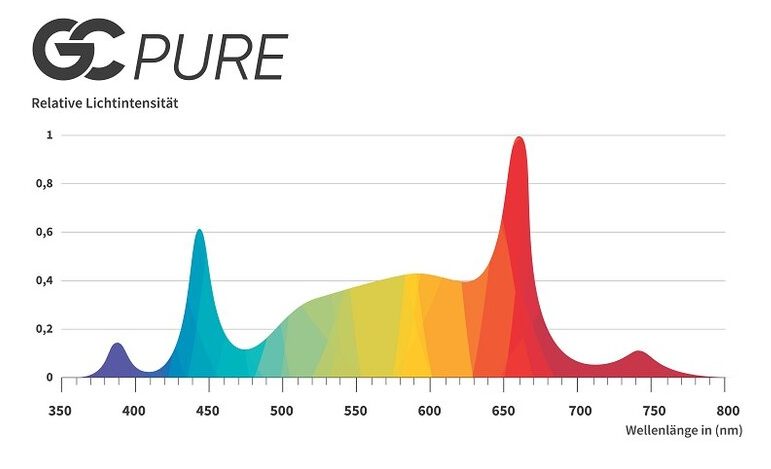 Erweitertes Spektrum. Wie bei den vorangegangenen Serien nutzen auch die neuen GC-PURE Modelle das erweitertes Lichtspektrum, das sowohl UV- als auch Far-Red-Bereiche abdeckt. Sie können sich auf höhere Konzentrationen von aktiven Inhaltsstoffen und Terpenen, solides Wachstum und signifikant höhere Photosyntheseraten freuen.