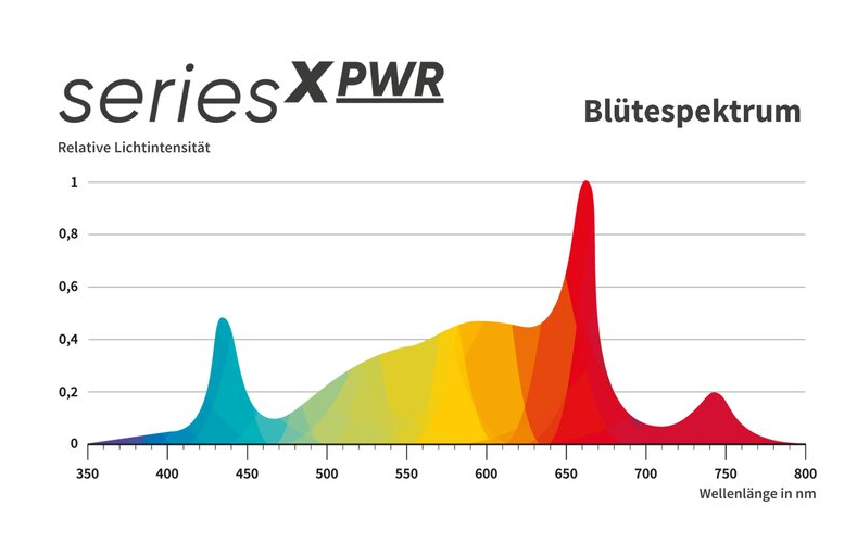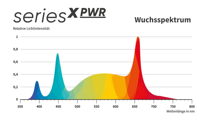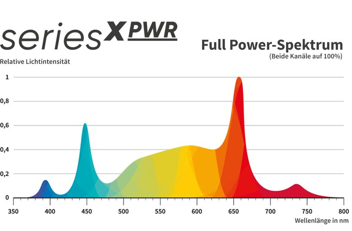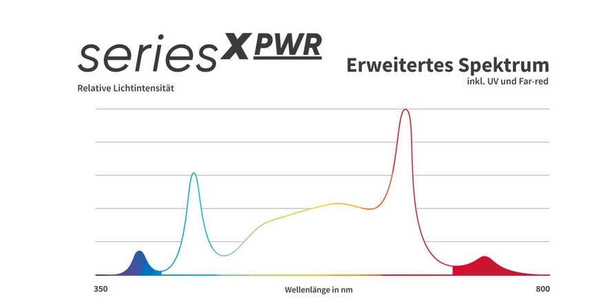 Wie bereits in der Vorgänger-Generation setzen wir auch bei der seriesX PWR selbstverständlich auf ein um UV-Licht und Far-Red erweitertes Vollspektrum (385 bis 730 nm). Freuen Sie sich auf signifikant höhere Photosyntheseraten.