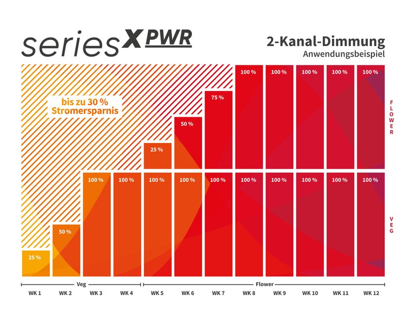 Mit den neuen Pflanzen-LEDs der seriesx PWR ist es endlich möglich, zwei verschiedene Lichtspektren individuell zu dimmen. Mit Hilfe unserer 2 Kanäle (Wachstums-und Blütespektrum), können Sie das Pflanzenlicht individuell an die aktuellen Bedürfnisse Ihrer Pflanzen anpassen und dabei gleichzeitig jede Menge Strom einsparen: Während man herkömmliche Pflanzen-LEDs zwangsläufig höher gehängt hat, kann man unsere neuen Modelle einfach runterdimmen.