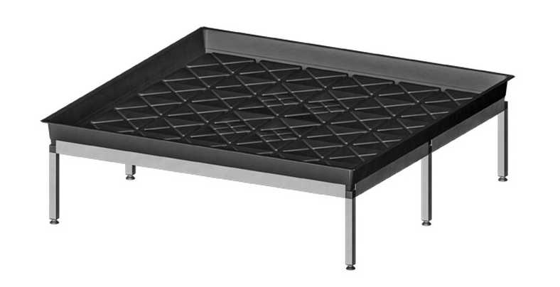 In der Höhe verstellbare 6 Gewindefüße bzw. Drehteller zum justieren der Rackneigung für das Gefälle zum ablaufen des Wassers im Fluttisch