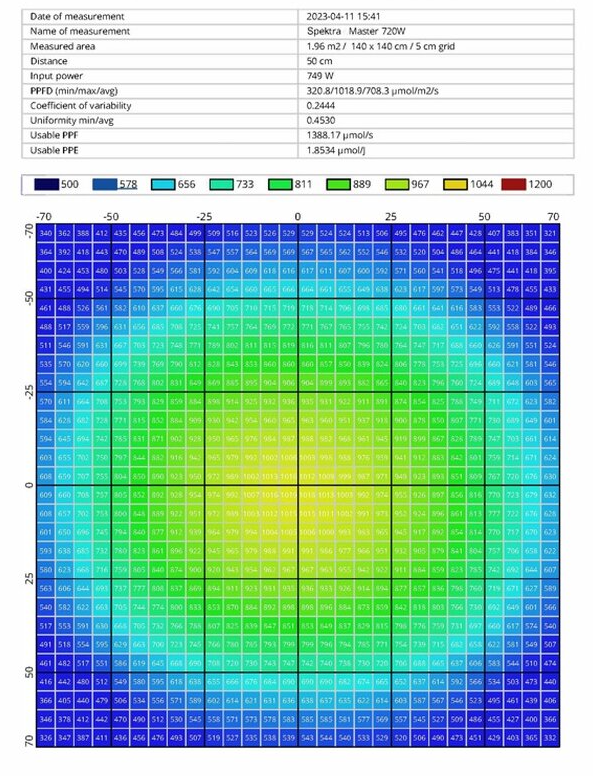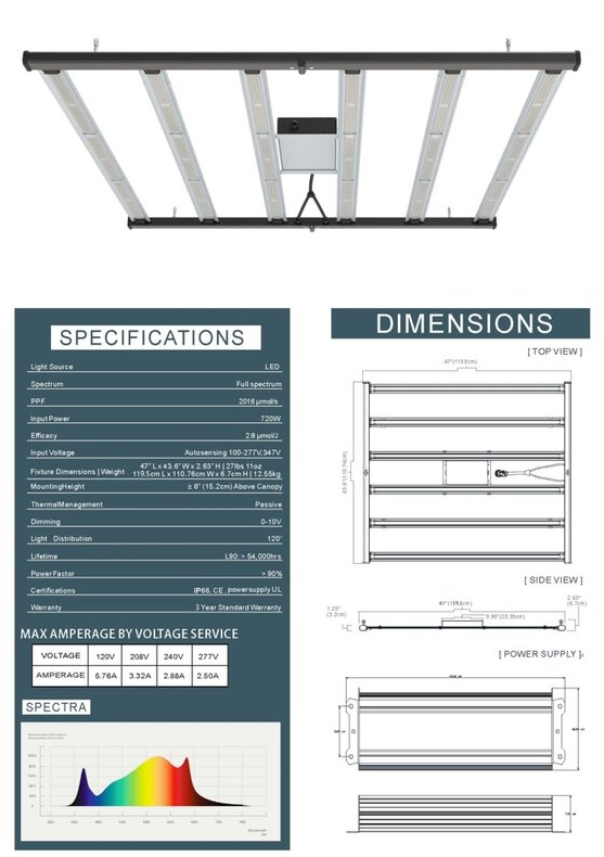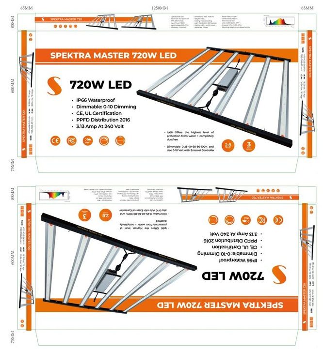 Die dimmbare Spektra Master 720W LED-Pflanzenlampe verfügt über 6 Lichtleisten und ist optimal für eine Fläche 120x120cm bis 150x150cm. Ideal geeignet für Gewächshäuser oder klimatisierte Räume. Sie gewährleistet optimale Lichtdurchdringung und unterstützt alle Kultivierungsphasen mit ihrem hervorragenden Vollspektrum.