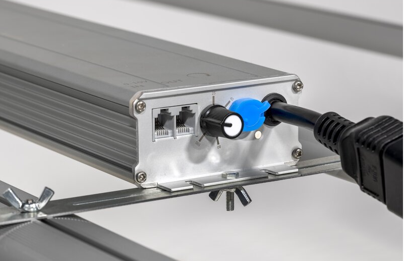Die Spektra Master LED kommt mit einem manuellen Dimmer, womit die LED Pflanzenlampe in den Bereichen von 20% - 100% manuell gedimmt werden kann. Die Spektra Master kann ebenfalls mit einem externen Dimmer betrieben werden. Befindet sich die Spektra Master bereits über den manuellen Dimmer in einer gedimmten Phase, wird diese vom Controller ignoriert. Folglich steuert der externe Dimmer die weitere Dimmung der Lampe.
